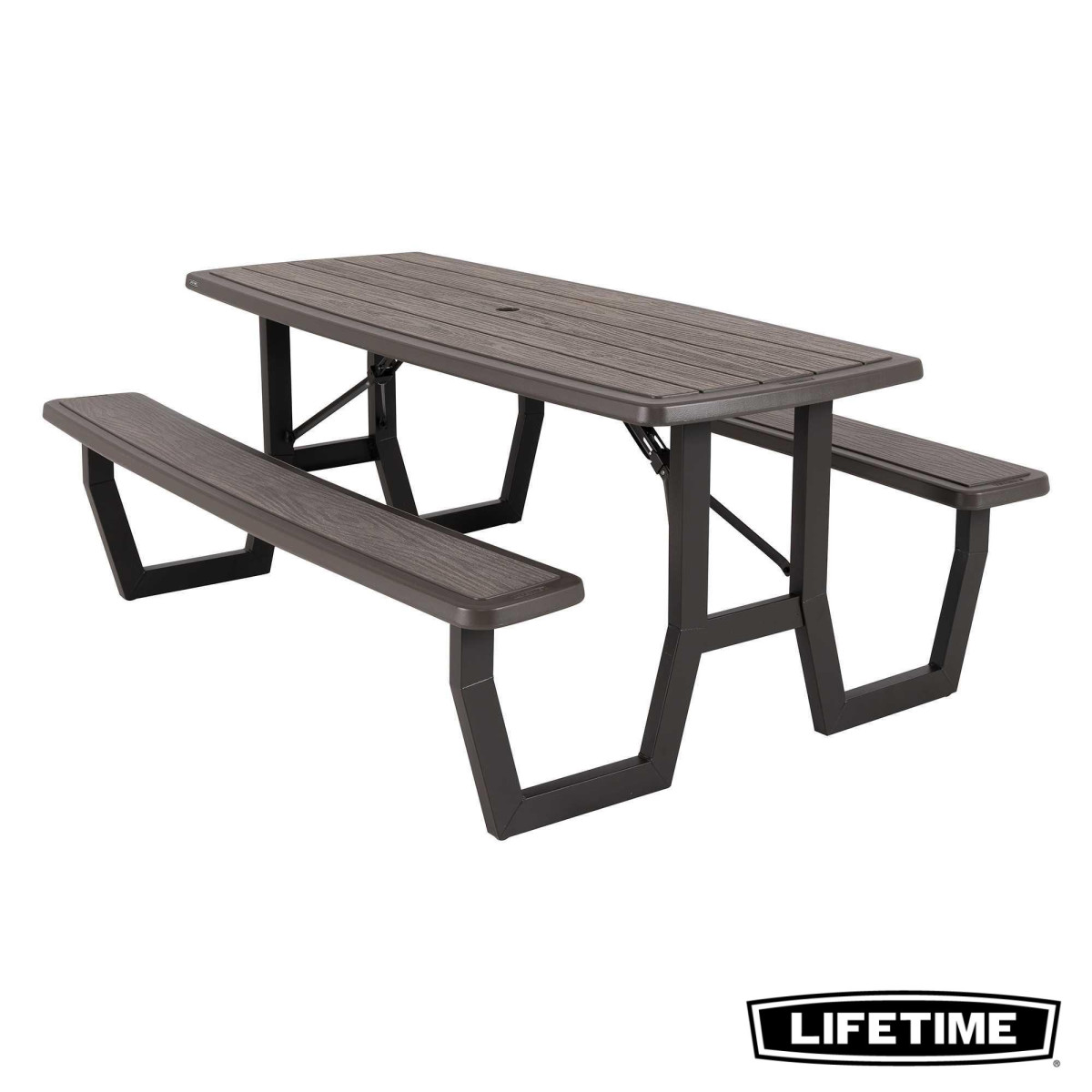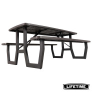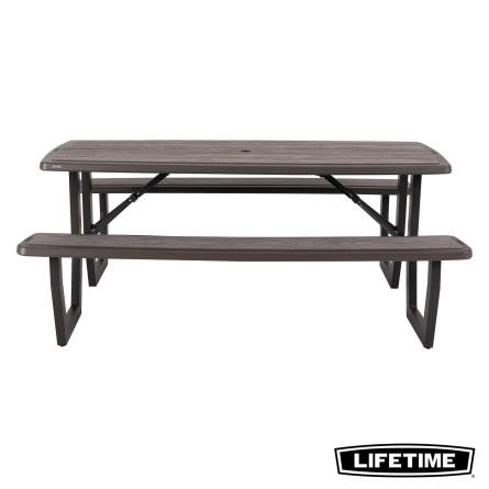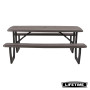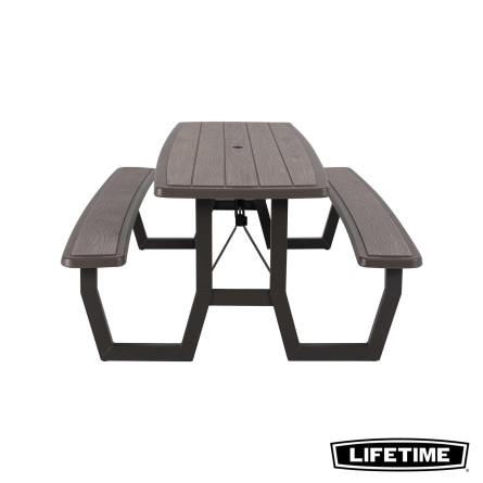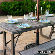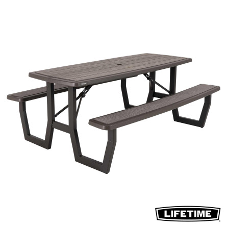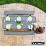 La table pliante 6 personnes de LIFETIME en polyéthylène haute densité, intègre les bancs. Son traitement anti-UV et anti-décoloration lui permettent une résistance aux tâches, aux intempéries et au jaunissement. Plus solide et plus durable que le bois, elles nécessite peu d'entretien, résiste aux tâches et facile à nettoyer. La table est équipée d'un trou de diamètre de 4.5 cm pour accueillir un parasol.